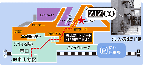 "クレスト恵比寿"正面玄関です。 ジズコショップへは、白い階段を上り、 ホール奥右にあるエレベーターに乗って 11階 です。 |