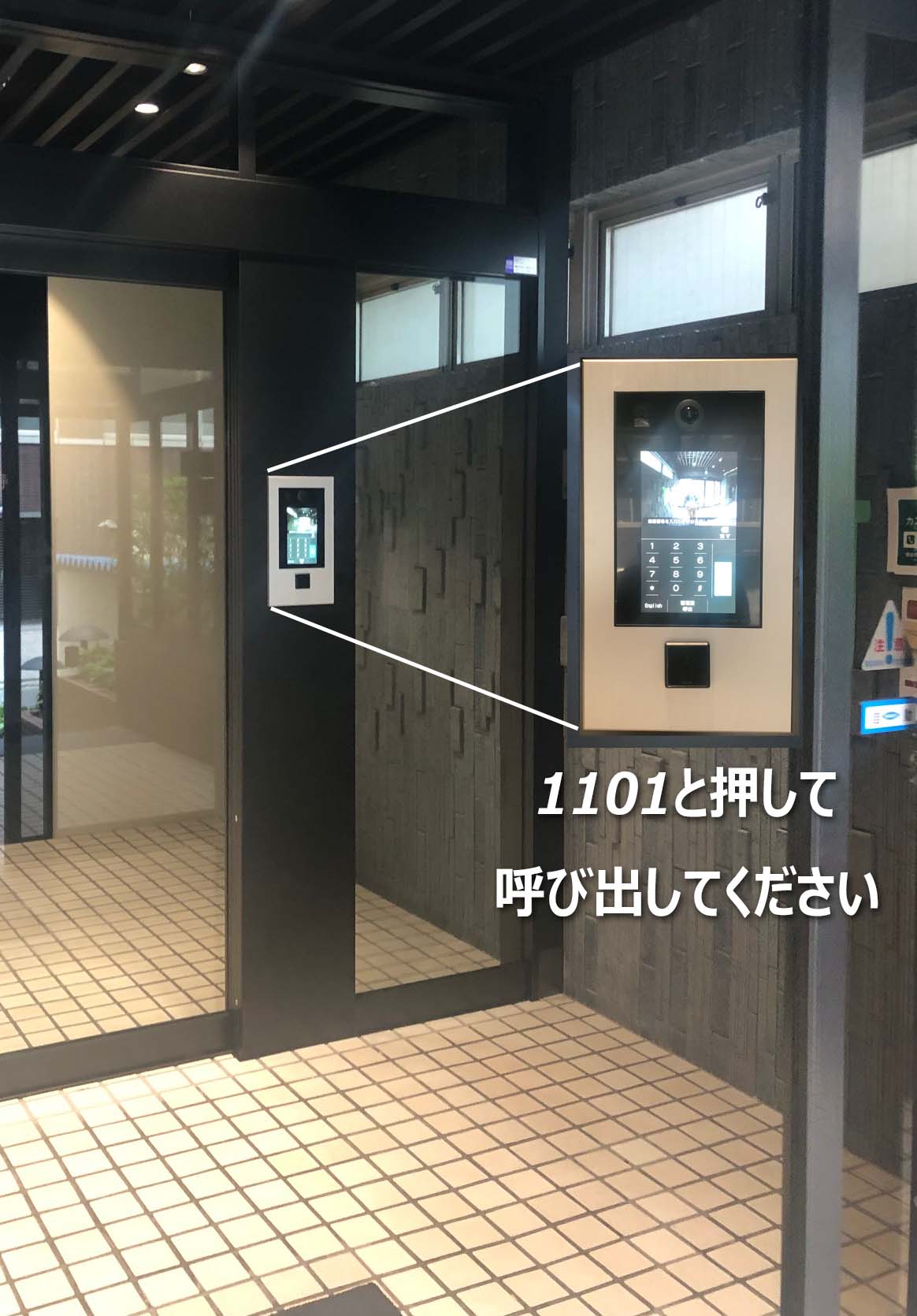 建物の正面玄関はオートロック式です。 左画像のタッチパネルで 1101 と押して呼び出してください。 |
