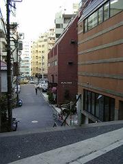 細い道を渡るとすぐ、中央に手すりがある石段に突き当たります。 石段を下って右手2軒目が目指す "クレスト恵比寿" です。 |