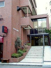 上の写真を部分的に切り抜きました。 真ん中の小豆色の建物 (上階は白壁) です。 駅ビルの階段を下り、このビルに向かってまっすぐ進みます。 細い一方通行の道路を渡ると、下りの石段が見えてきます。 |