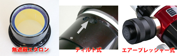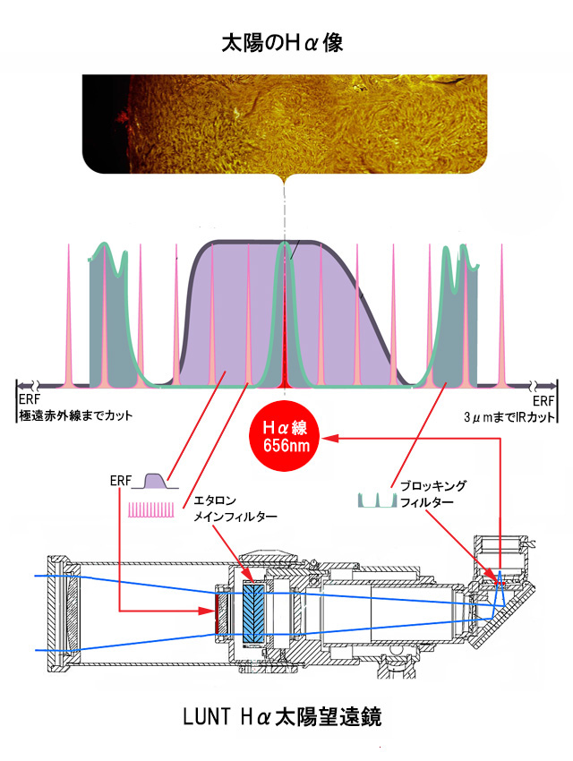 太陽観測システムは、時と場所を問わず 「だれにでも安全に使用できること」 が前提です。以下、ラント社製Hα太陽望遠鏡に組み込まれるフィルターについて解説します。 Hα太陽望遠鏡の心臓部は、656nmのHα線を抽出して超狭帯域で透過するメインフィルターです。ラント社は、その心臓部に独自の無遮蔽エタロンを採用。光路中に遮蔽物を介在させない妥協無き設計思想に由来します。 メインフィルターは2つの反射率の高いコート面を平行に配置したエアースペースエタロン (原理はファブリ ーペロエタロン)。太陽が放つ白色光並行光線のほとんどはエタロ ン構造のコーティング面で反射します。エタロンのエアースペース間隔を入射光波長x0.5の任意の整数倍に設定することで、特定の光線だけをエタロンを透過させます (Hα太陽望遠鏡の場合、透過波長が水素波長 「656nm」 になるよう設定)。 上の図を参照ください。最初に、有害な紫外線、熱等を「ERF (エネルギー遮断フィルター)」が遮断。次に、「エタロンメインフィルター」がHα観測に必要なスペク トル線を0.6-0.7Åの狭帯域で抽出。最後に、接眼部後の「ブロッキングフィルター」がその他の透過波長をブ ロックします。これにより、太 陽の水素波長_6562.8Å/656nmだけを観測す ることができるわけです。 メインフィルターのエアースペースエタロンは二枚の融解石英で、二枚が向き合う面の間隔を約200ミクロンに近づけた構造。水素波長だけを0.6〜0.8Åの超狭帯域で透過し、なおかつ高い透過率を実現するには、二面の並行面交差を光の1/100波長以上に仕上げます。これは実現できうる最も高い精度ですが、物理的な値で表せば、エタロン2面の精度はいずれもパーフェクト面からの誤差を0.000005mm (0.0000002インチ) 未満に抑えた状態です。このように、エアースペースエタロンは桁違いの精度が要求される構造体で、エタロン板がわずがに歪むだけで性能は大きく劣化してしまいます。ラント社のHαフィルターはエタロンを直接加圧しないティルト式またはエアープレッシャー式で透過波長を調整するため、エタロンの特性を劣化させることなく、眼視はもとより、撮影において安定した性能を発揮します。 エタロン面には独自のハードコートが採用され、長期にわたる使用が可能。いずれも、NASAの「スターウォーズ」計画でも採用された技術で、耐温度特性が一般的なコート 技術と比較して非常に高く、太陽観測などの過酷な条件にも余裕で対応します。ブロッキングフィルターの一部は定期的に交換しますが、交換が必要なのは構成フィルター中最も安価な部分です。