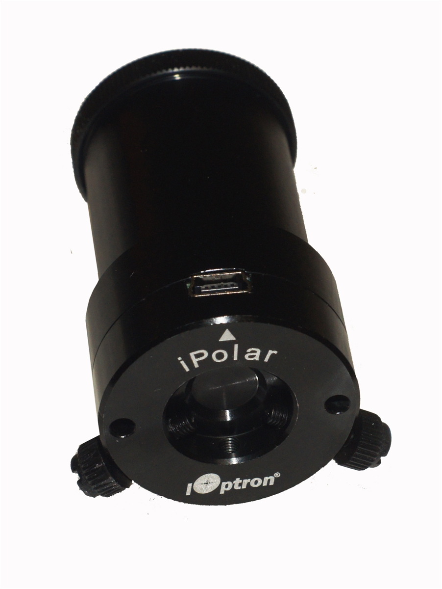 iOptron社の電子極軸望遠鏡 iPolar "アイポーラー" は、極星を広い写野で捉える受光素子と光学系のユニットを、赤道儀の赤経軸に装着して使います。