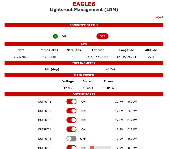 EAGLE 本体にインストールした EAGLE Mnanager X は自動的に起動し、スマートフォン、タブレット、PC から EAGLE 本体を遠隔制御できます。 ◆ 各12V電源出力ポートの有効化/無効化 ◆ 電源および USB ポートの名称指定 ◆ Grobal Positioning System ◆ Bortle 1.0 "EYE" ◆ 3 x 0-12V power out ports ◆ Inclinometer ◆ Motion Detector ◆ DARK mode ◆ GHOST mode ◆ CTRL-IN port ◆ CTRL-OUT port ◆ 4つの USB ポートにつないだデバイスの接続切断 ◆ 消費電力とバッテリー残量のチェック ◆ WiFi 接続の切り替え ◆ 自動電源ルーチンの設定 ◆ ECCO コントローラへの自動接続 ◆ EAGLE センサーのデータ保存 |