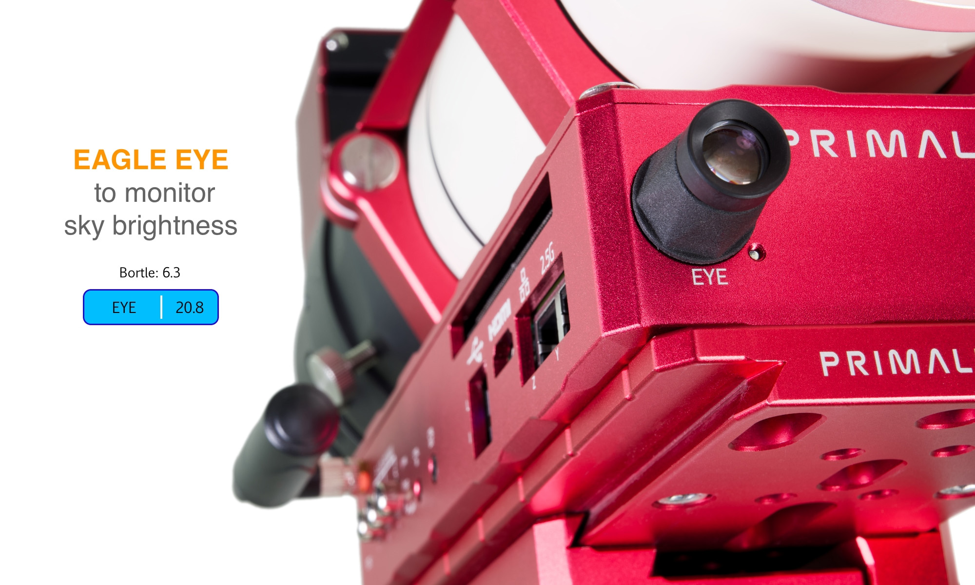 望遠鏡の視野に捉えた空のクオリティを知りたいことはありませんか? 屈折望遠鏡の駆動中、睡眠中に夜空を監視したいと思ったことはありませんか? 新開発の EYE センサーは、望遠鏡が向く先の 5 度の視野域に限定して空の明るさを mag/sq arcsec (magnitude per square arc second) 単位で自動的に計測します! EYE の数値が EAGLE Manager X でリアルタイムに表示されるため、必要なスカイクオリティを容易に監視できます。EAGLE4 には、本体の両端に 1 つずつ、計 2 つの EYE センサーが装備されています。EAGE 本体と望遠鏡の位置関係はケースバイケースなので、ネジ脱着式のセンサー用レンズを、望遠鏡が向いている方向に切り替えて装着できます。あとは、EAGLE Manager でレンズの位置を適切に選べば、夜空の明るさを読み取ることができます。