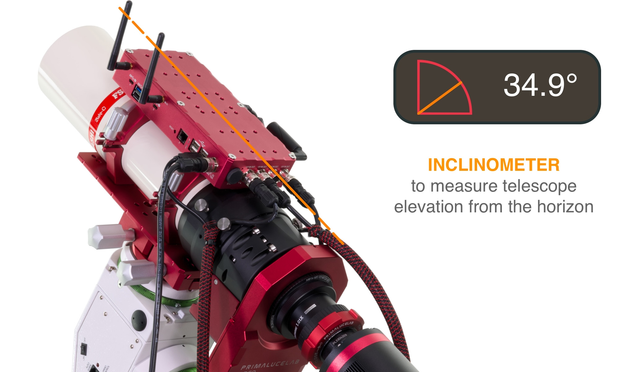EAGLE6 シリーズに内蔵された傾斜計は、0.1 度の解像度 (実測平均誤差1度未満) で望遠鏡が地平線に対して傾いている角度を計測します。測定した傾斜情報は、EAGLE Manager X にリアルタイムで表示されます。また、EAGLE 本体は望遠鏡と並列に設置されるため (EAGLES 本体が前後逆に装着された状態でも正しく計測される)、望遠鏡が正しい高度に向いていること、赤道儀マウントの高度が撮影地の緯度に正しくセットされていること、あるいは、経緯台のホームポジションの高度が正しくセットされていること、などを遠隔で確認できます。