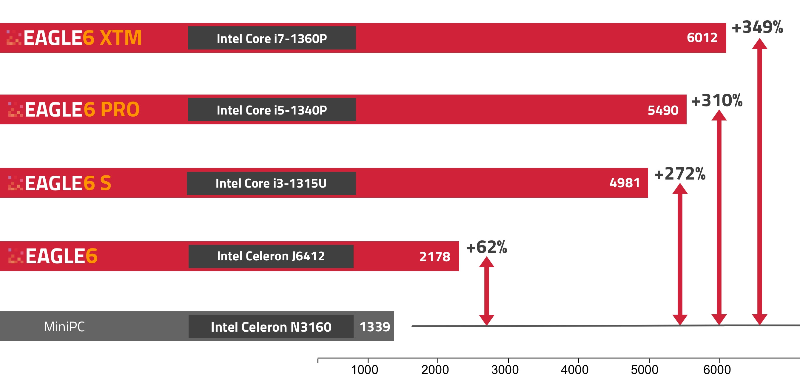 すべての天体撮影ソフトをインストールし、撮影データを保存する高速 SSD ドライブ EAGLE 本体には、高速かつ耐久性に優れ、従来型ハードディスクのような駆動機構の無い SSD ドライブを内蔵。充分な容量 (128-2TB) に撮影画像を保存し、ドライブ内で処理することも可能。さらに、ハイスピード USB ポートに差し込んだフラッシュドライブ (USBメモリ) に撮影画像を保存し、機材接続ケーブルを脱着することなく、撮影を終えた直後に外部 PC に速やかに移し、その場で画像処理することもできます。本体部品は耐温度域が広く設計されているため撮影中の信頼性が高く、プロセッサから出る熱も少ないため湿度由来の問題も防ぎます。以下、市場で入手できる一般的な Mini PC との性能を比較した実測データです。