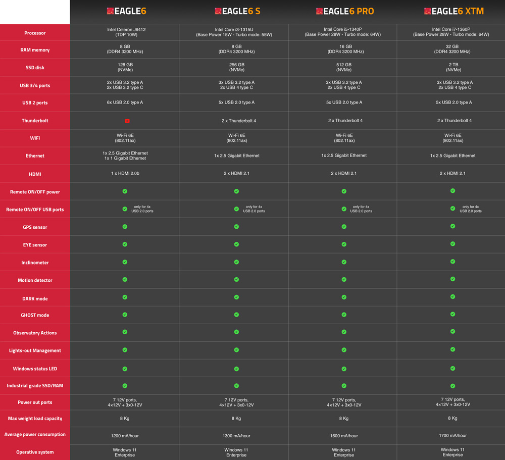 Windows 11 Enterprise OS をベースにしたパワフルなコンピュータ "EAGLE6"。天体望遠鏡システムのリモートコントロールとパワーマネージメントをワンデバイスで実現する最も先進的な PC です。好みの Windows 対応ソフトをインストールし、お使いの望遠鏡システムで、よりシンプルなケーブルマネージメントを構築できます。