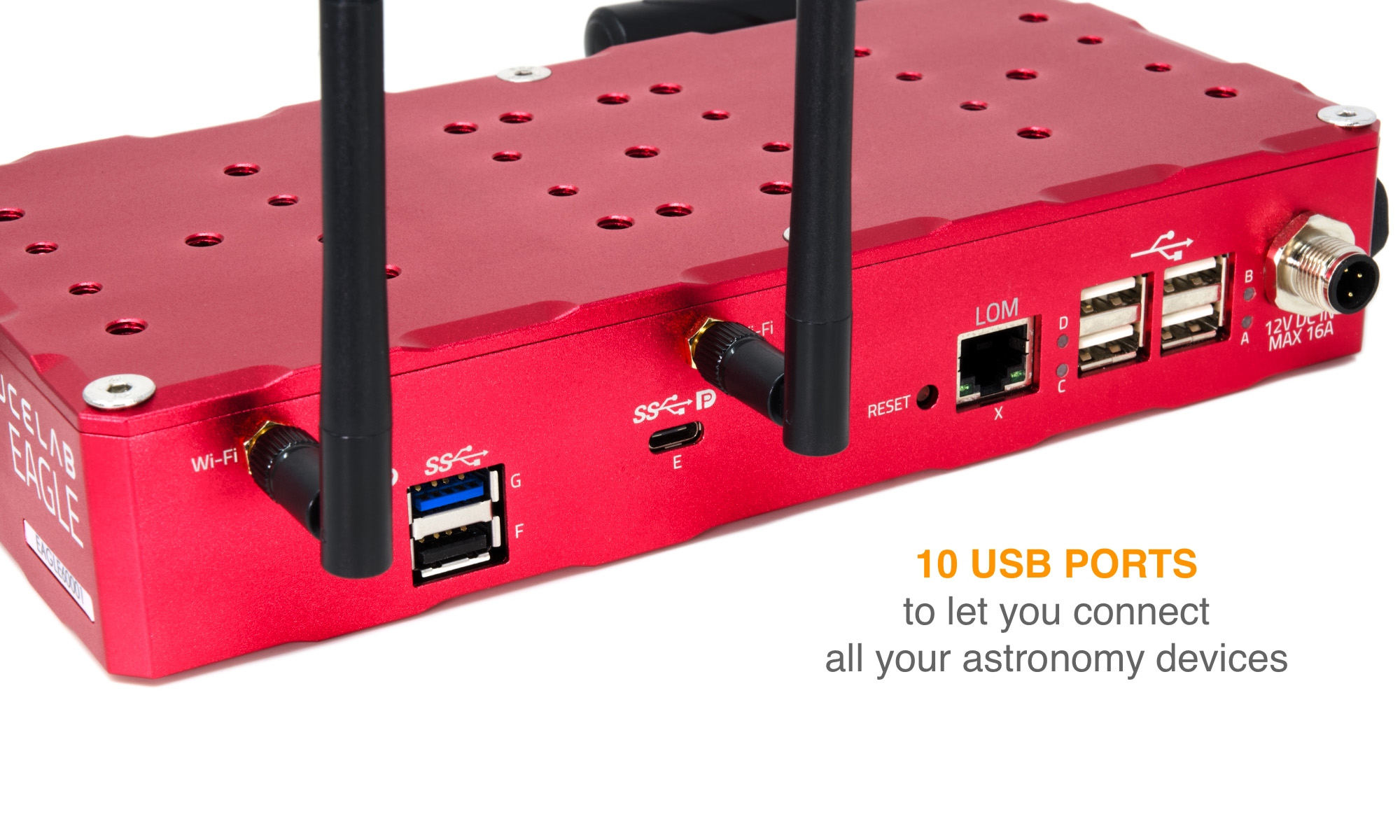 10 もの USB ポートを備える EAGLE6 には数多くのデバイスを接続し制御できますが、ユーザーが撮影システムまで足を運ばなくても、必要に応じて USB ポートを遠隔でオン/オフできます。不要なポートをオフにすることで電力をセーブできるだけでなく、デバイス接続が正常に行われないポートがあれば、そのポートだけにリセットをかけることもできます。モデルにより異なりますが、高速の USB ポートに最新の撮影デバイスを接続して撮影した月、惑星、太陽の動画を、内蔵 SSD ドライブに保存するこも可能です。